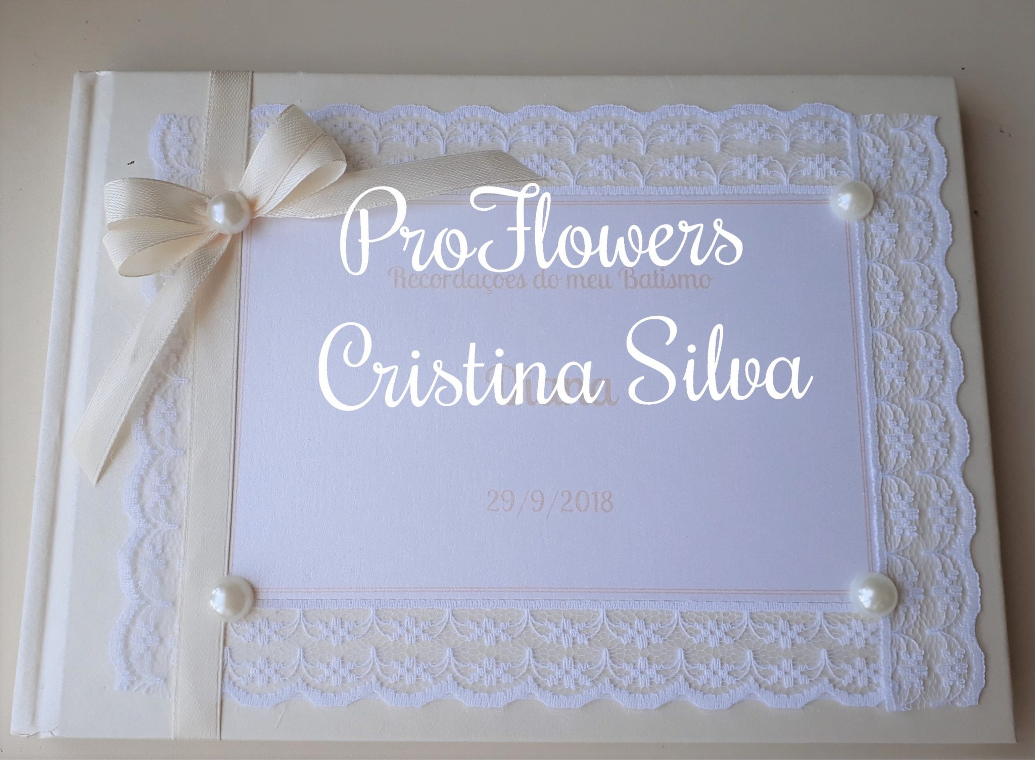 Livro de honra 21x16cm personalizado com aplicação de renda. Tem 35 folhas/70 páginas